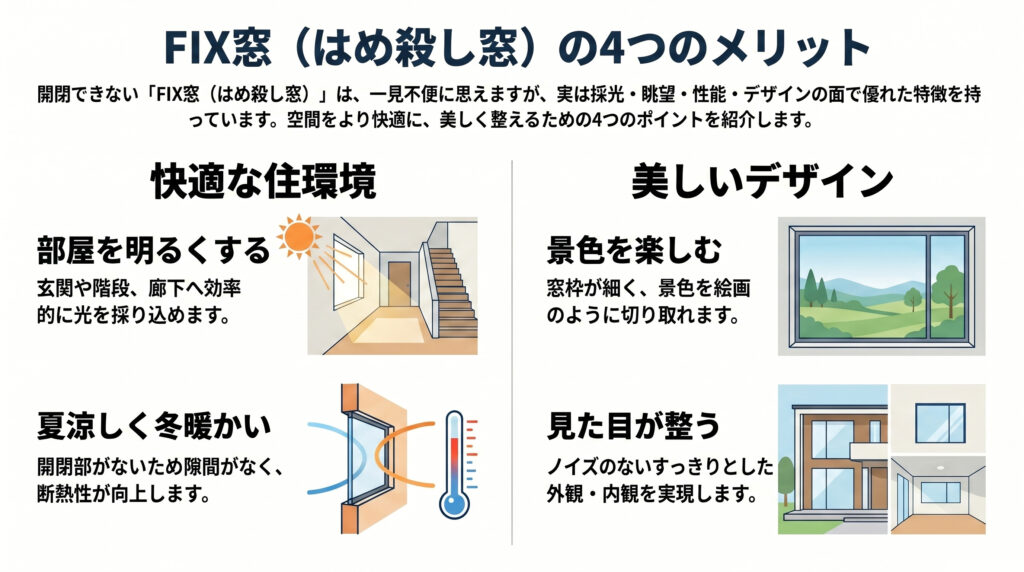 もちろん、実際の断熱性能はガラスの種類、サッシの材質、施工精度にも左右されます。それでも、窓の種類として見たとき、FIX窓とはめ殺し窓は、開閉式の窓より性能をまとめやすい傾向があります。