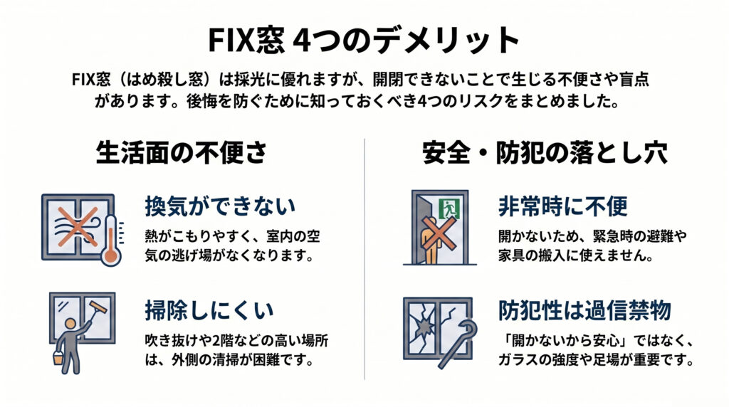 FIX窓とはめ殺し窓は開かないため、非常時の避難や、家具搬入、通風調整といった面では制限があります。もちろん、すべての窓にそうした役割を求める必要はありませんが、「ここは開く窓が一つもない」「採光優先で固めたら空気が動かない」となると、住み心地に影響します。