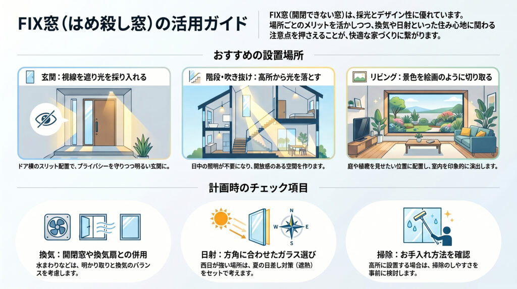 ただし、リビングは採光だけでなく換気、断熱、日射遮蔽も重要です。大きなFIX窓を南面・西面に使う場合は、夏の日差し対策まで一緒に考えるべきです。
