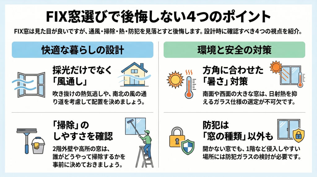 ALSOKでも、FIX窓は開閉部がない一方で、足場があれば侵入対象になり得るため、防犯ガラスや足場をつくらない工夫が有効だと案内しています。つまり、防犯は窓の種類だけでは決まらず、ガラス仕様、設置位置、周囲の足場状況まで含めて考える必要があります。