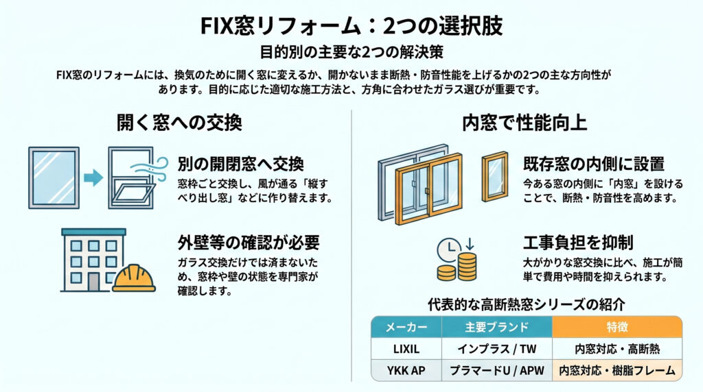 「やはり換気したい」「手が届く位置なら開けたい」という場合は、FIX窓を別の開閉窓へ交換するリフォームが候補になります。ただし、これはガラスだけの交換では済まず、窓枠や開口条件、外壁との取り合いまで確認が必要です。