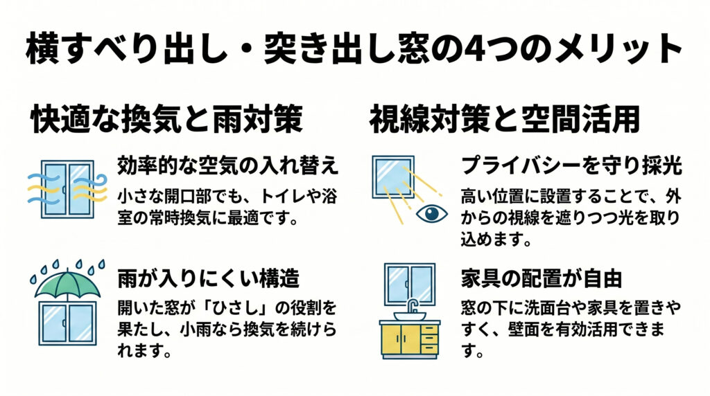 横すべり出し窓と突き出し窓のどちらも、トイレや洗面所に向いています。少し開けるだけで換気しやすく、視線を避けやすいからです。