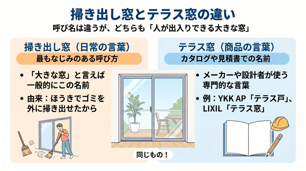 ただし、実務では少しだけニュアンスの差があります。掃き出し窓という言葉は、昔、掃除の際にほこりやごみを外へ掃き出したことに由来する生活用語です。一方、テラス窓は、庭やテラス、バルコニーへ出入りしやすい床近くの開口部という、設置場所や用途を含んだ表現として使われやすくなっています。